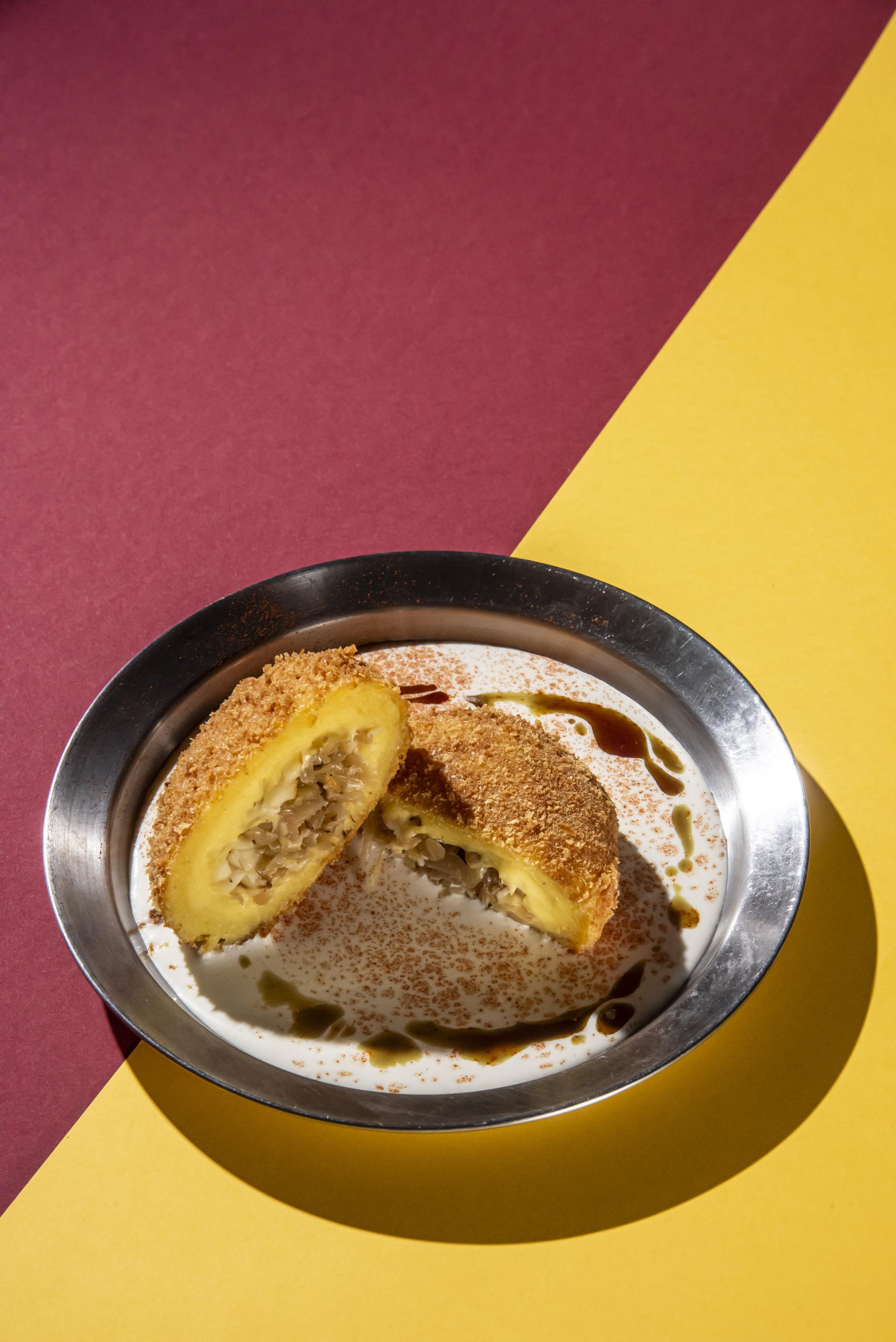 Oljuštite krumpir i narežite ga na kockice, skuhajte u slanoj vodi i propasirajte. Dodajte mlijeko, maslac i muškatni oraščić pa izradite u smjesu bez grudica. Kad se ohladi na sobnu temperaturu, umiješajte žumanjke i brašno da dobijete tijesto koje se ne lijepi. Isperite kupus i pirjajte ga na malo ulja dok ne ispusti svu tekućinu i dok tekućina ne ispari. Ohladite i dodajte kockice dimljenog sira. U ruku uzmite kuglicu tijesta od krumpira (oko 50 g), spljoštite je i dodajte žlicu nadjeva. Oblikujte kroket i stavite ga u zamrzivač na pola sata. Kroket uvaljajte u brašno, jaja i panko te pržite u dubokom ulju do zlatnožute boje. Pospite mljevenom slatkom paprikom. Za umak sve sastojke ubacite u lonac i ugrijte dok vrhnje ne zavrije. Izmiksajte štapnim mikserom i držite na toplom. Na kraju na tanjur stavite 3 žlice umaka od hrena, a na umak stavite kroket. Posipajte mljevenom slatkom paprikom i na umak stavite nekoliko kapi bučina ulja.