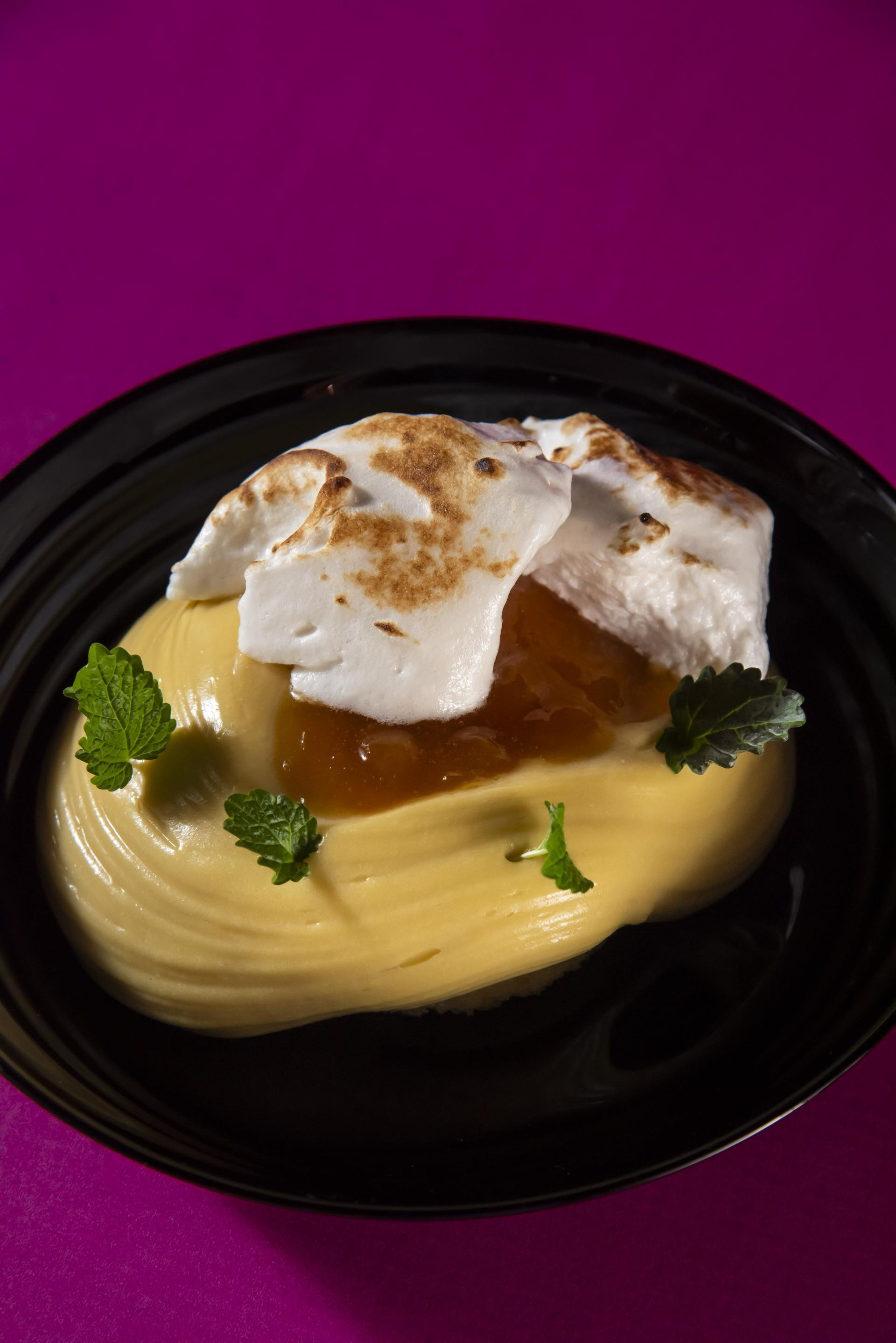 Za biskvit naribajte koricu naranče i pomiješajte je sa šećerom dok naranča ne ispusti aromatično ulje. Dodajte ostale sastojke i dobro izmiksajte (može i u blenderu). Pecite 30 minuta u pećnici na 170 °C. Kad izvadite iz pećnice, prelijte hladnim mlijekom i ohladite. Za slastičarsku kremu u zdjeli dobro promiješajte žumanjke, šećer, gustin i amaretto. Zagrijte mlijeko i vrhnje. Temperirajte smjesu sa žumanjcima, vrelim mlijekom i vrhnjem. Vratite sve u posudu s ostatkom mlijeka i vrhnja te kuhajte na laganoj vatri dok se ne zgusne. Umiješajte maslac, prebacite u posudu, prekrijte prozirnom folijom i stavite na hlađenje 6 sati ili preko noći. Prije upotrebe izmiksajte ili dobro izmiješajte pjenjačom. Breskve ocijedite od tekućine i narežite na kockice, naribajte svježi đumbir i kandirani narezan na sitne kockice. Dodajte sve ostale sastojke i kuhajte na laganoj vatri dok se smjesa ne zgusne. Za meringu u mikseru miksajte bjelanjke s malo soli i 100 g šećera (trebate imati srednje čvrste vrhove). U lončić stavite 400 g šećera i 100 g vode na srednje jaku vatru neka kuha dok ne dosegne temperaturu od 120 °C. Ulijevajte sirup lagano u tankom mlazu u smjesu od bjelanjaka i miješajte mikserom na najvećoj brzini (mora biti gusta i sjajna). Na kraju na dno tanjura stavite disk od biskvita, prekrijte slastičarskom kremom i žlicom napravite udubinu. U nju stavite kompot od breskve. Stavite žlicu meringe i malo je spalite brenerom.