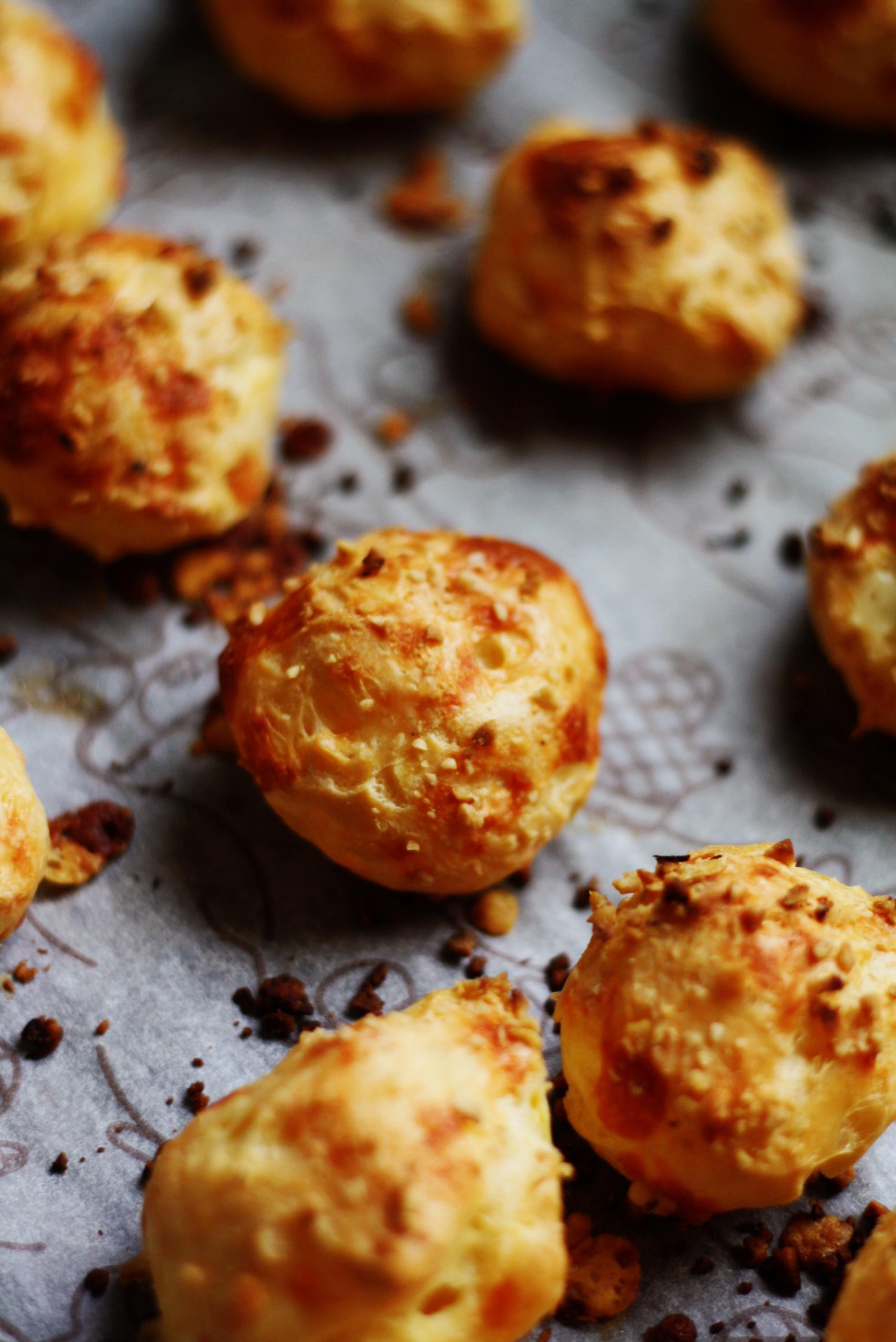 U posudu stavite vodu i maslac pa kuhajte dok se maslac ne otopi i dok se sve skupa ne zagrije. Posolite. Dodajte brašno i ukuhajte u gustu pastu koja se odvaja od stranica posude. Maknite s vatre, kratko ohladite, prebacite u posudu za miksanje pa uz miksanje dodajte jedno po jedno jaje. Kada se smjesa sjedini, dodajte 3/4 sira i umiješajte ga. Smjesu prebacite u slastičarsku vrećicu i istiskujte hrpice na papir za pečenje kojim ste obložili posudu za pečenje. Pospite ostatkom sira i sjeckanim lješnjacima. Pecite na 180 stupnjeva 15-ak minuta ili dok ne poprime boju, ovisno o veličini. Poslužite samostalno ili uz dodatke po želji.
