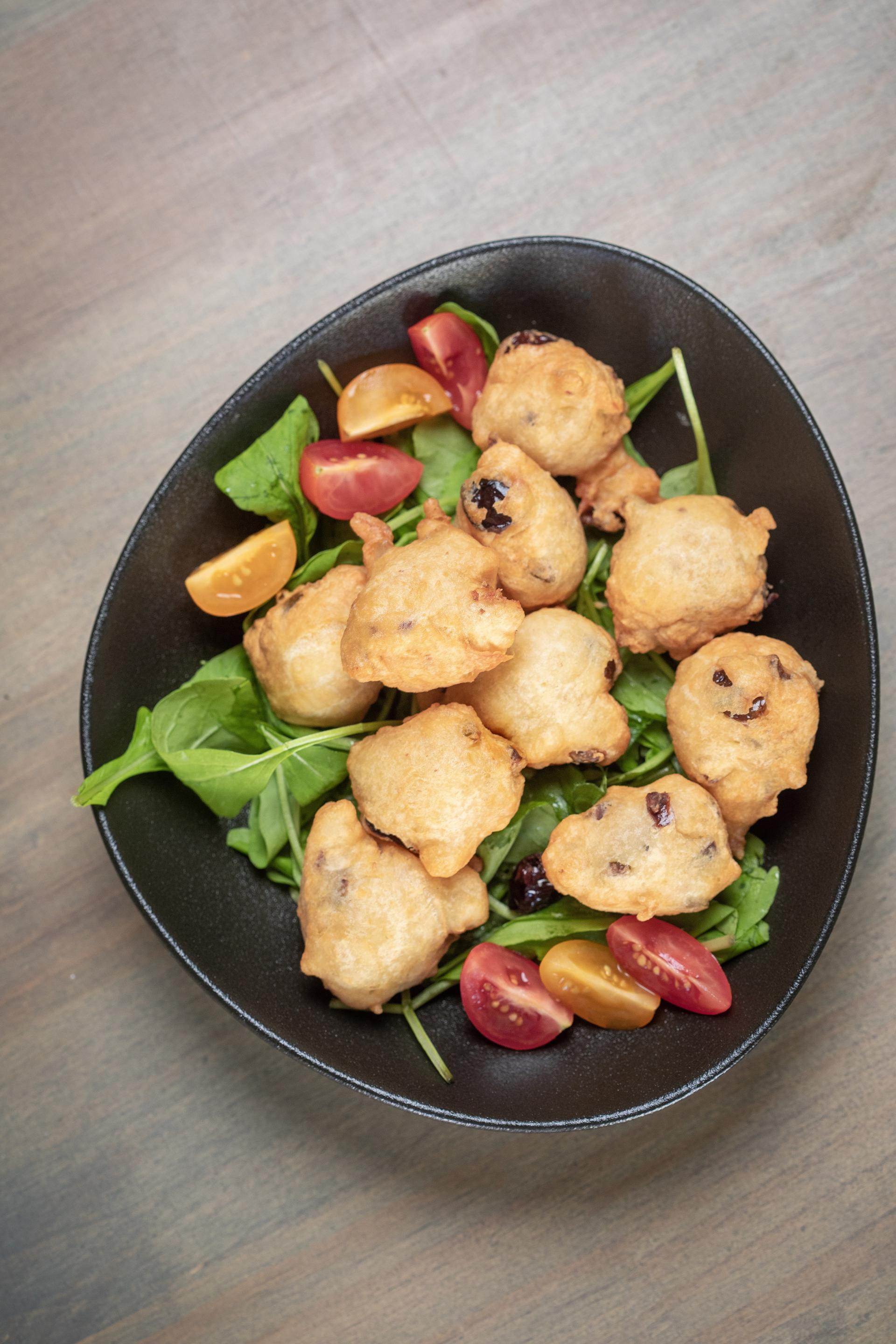 Pomiješajte sve sastojke. Zagrijte ulje. Napravite kuglice s dvije žlice umočene u ulje i pržite na 170 stupnjeva nekoliko minuta dok ne poprime zlatnožutu boju. Poslužite uz čašu vina, najbolje pošipa, grka, malvazije...
