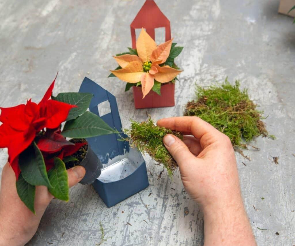 Korak 4: Kod otvorenih kućica, dno napunite mahovinom. Ona će držati mini božićne zvijezde stabilnima i dati prirodan izgled. Zatim stavite biljke u posudama u kućice i oko njih rasporedite dodatnu mahovinu da sakrijete posude. Savjet: Dobro zalijte biljke prije postavljanja.