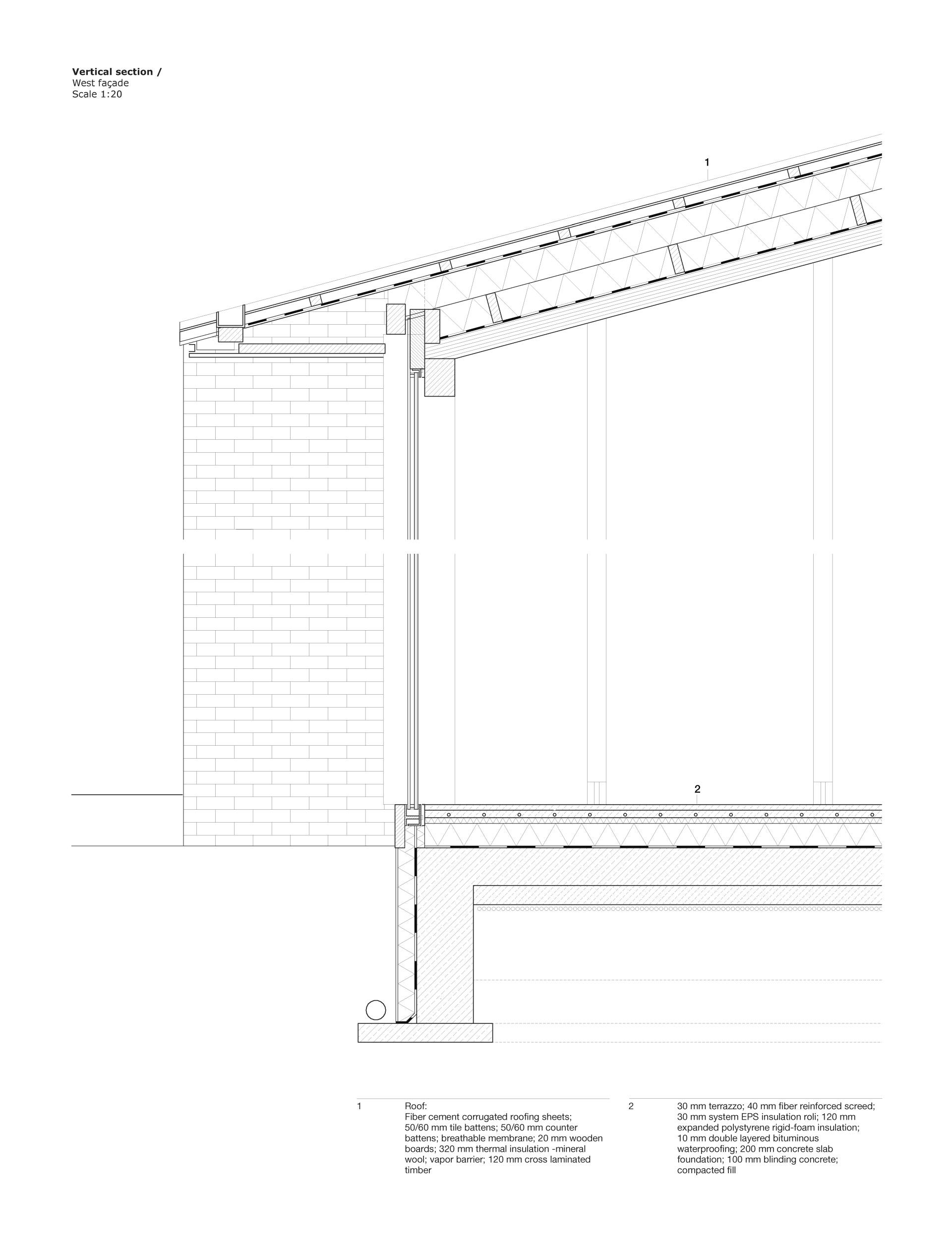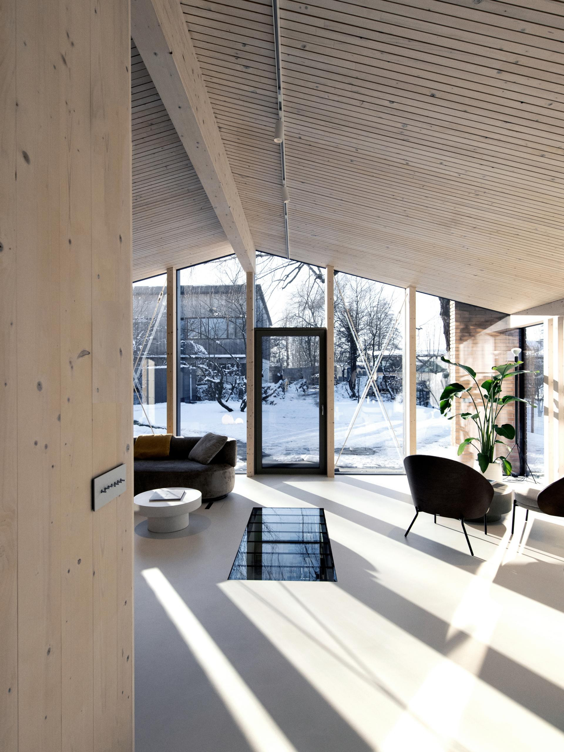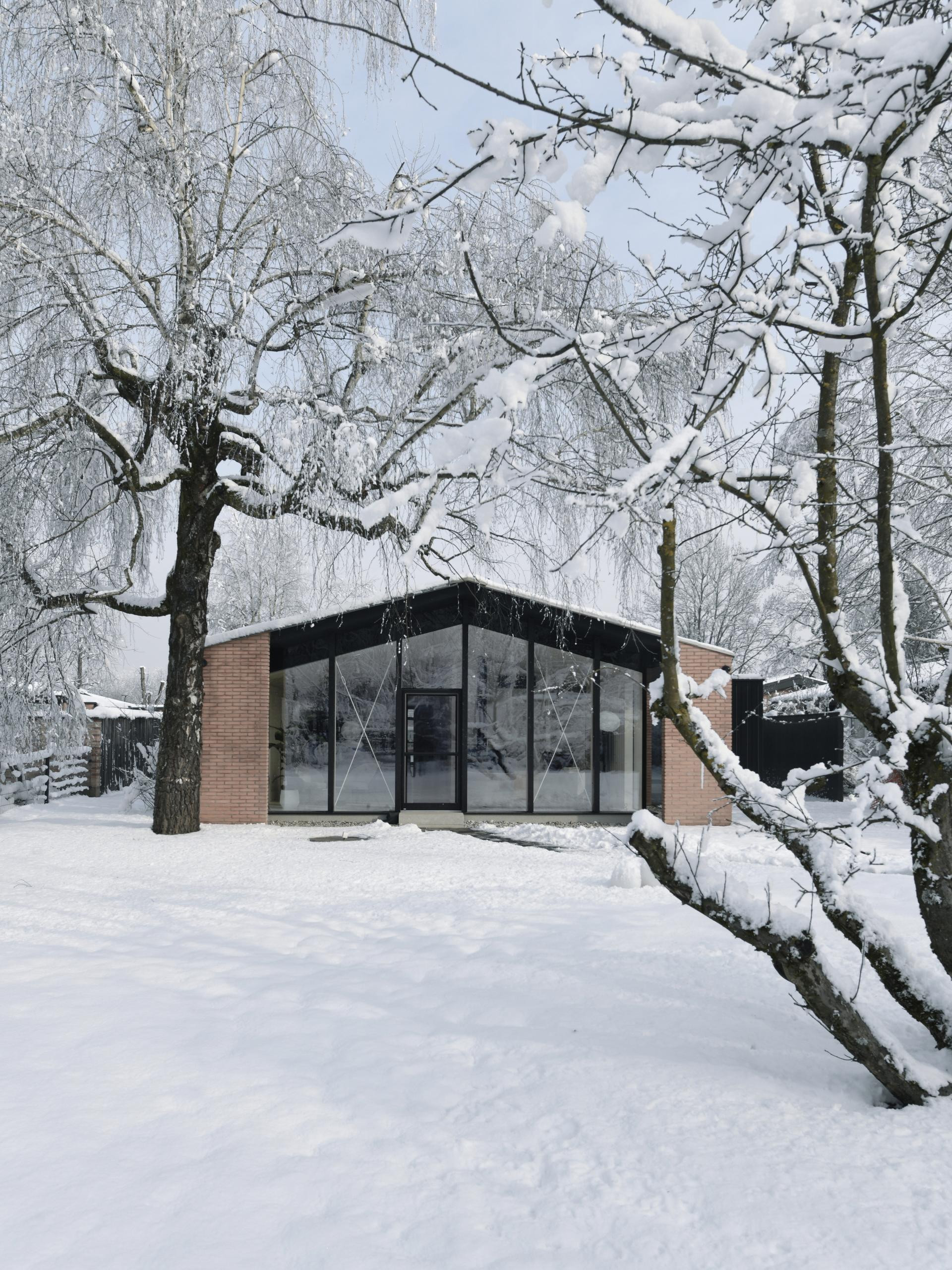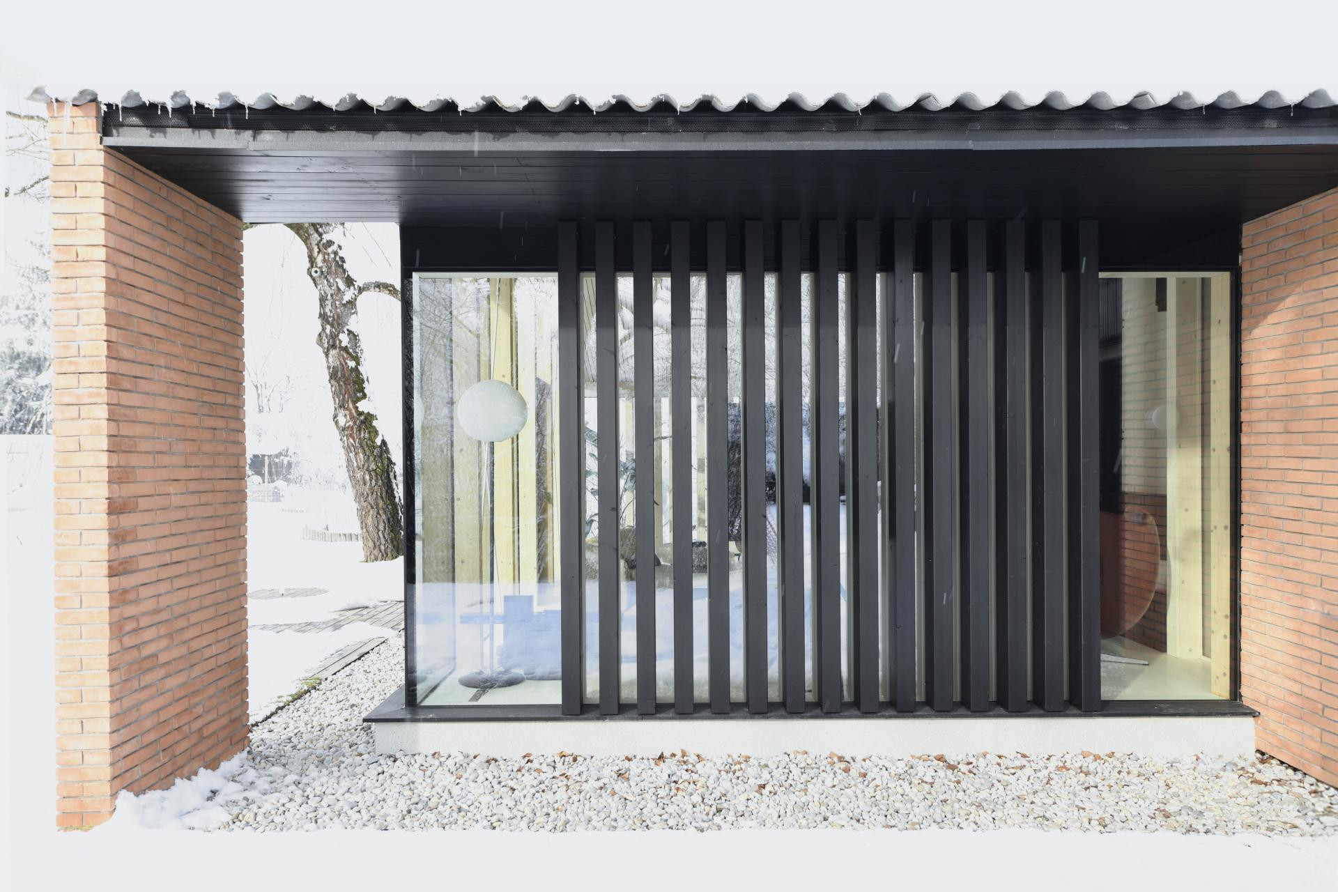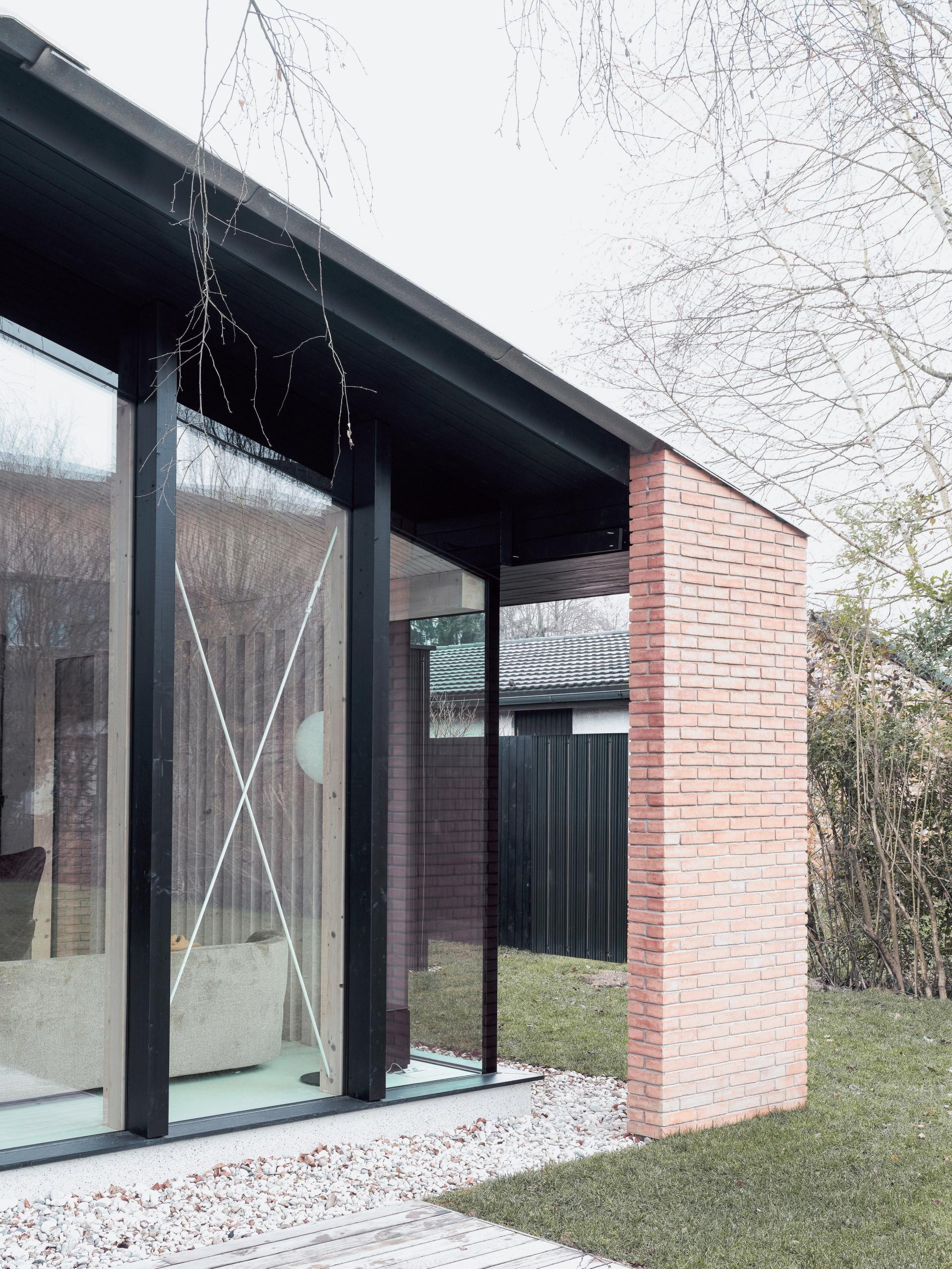 Postojeća velika breza na zapadnoj strani dogradnje zadržana je i temelj je pažljivo prilagođen njezinu korijenju. Izduženi krov povezuje glavnu kuću s dogradnjom, a stakleni volumen funkcionira kao produžetak dnevnog prostora, brišući granicu između interijera i vrta. Bočne stijenke obložene su vertikalnim drvenim panelama koje stvaraju osjećaj intime i zaštite. Dogradnja tako djeluje kao „kuća unutar kuće“, dok prostor pod širokom strehom osigurava zaklon od kiše i ugodnu sjenu tijekom ljeta.
