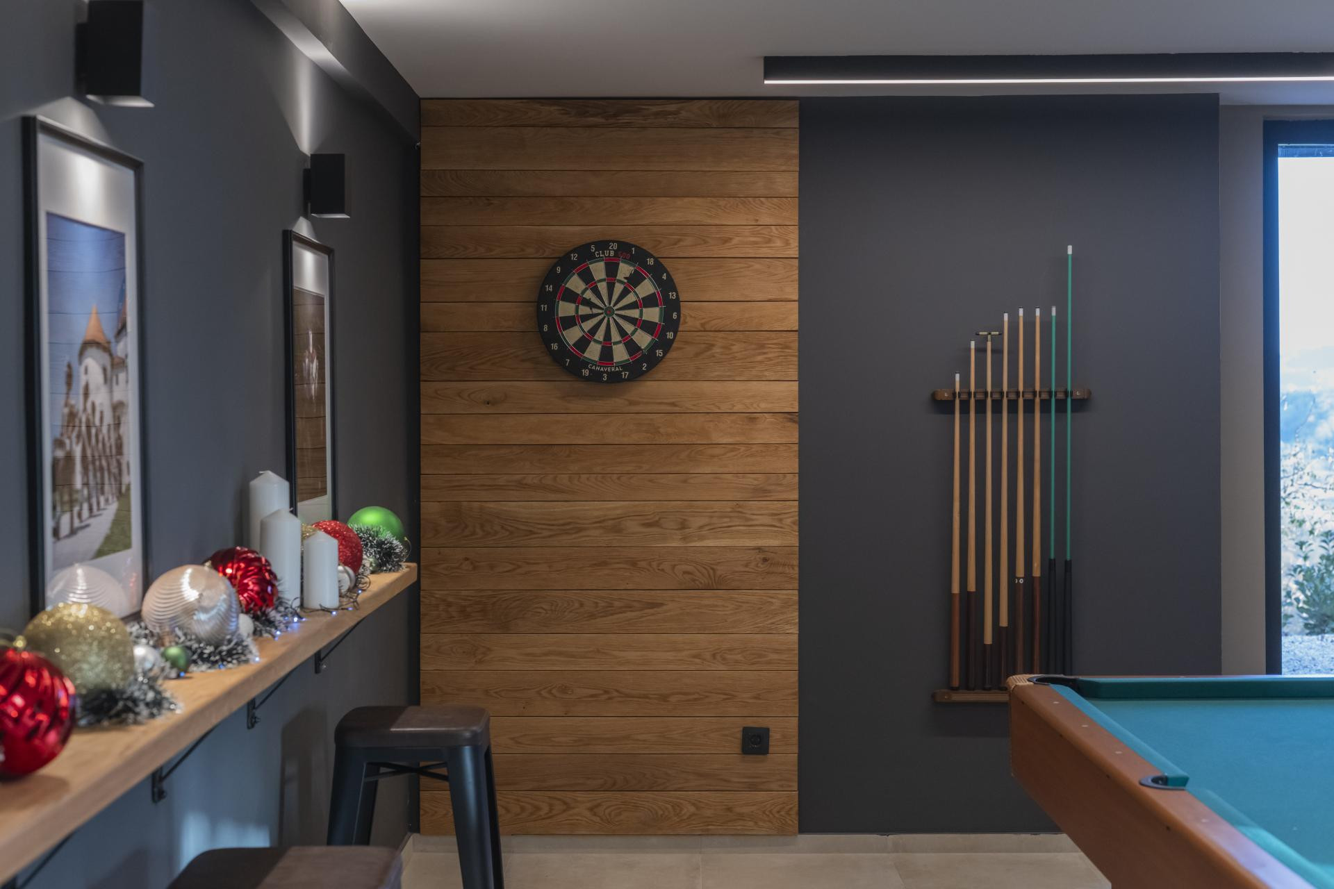 Kuća ima 230 kvadrata. Sastoji se od tri spavaće sobe s ukupno devet ležajeva, dječje igraonice, wellness dijela s jacuzzijem i saunom, velikog dnevnog boravka, kuhinje, blagovaonice, sobe za zabavu s biljarskim stolom i whiskey cornerom, grijanog vanjskog bazena, roštilja i pečenjare, kamina te velikog dvorišta s dječjim igralištem i mini nogometnim terenom.