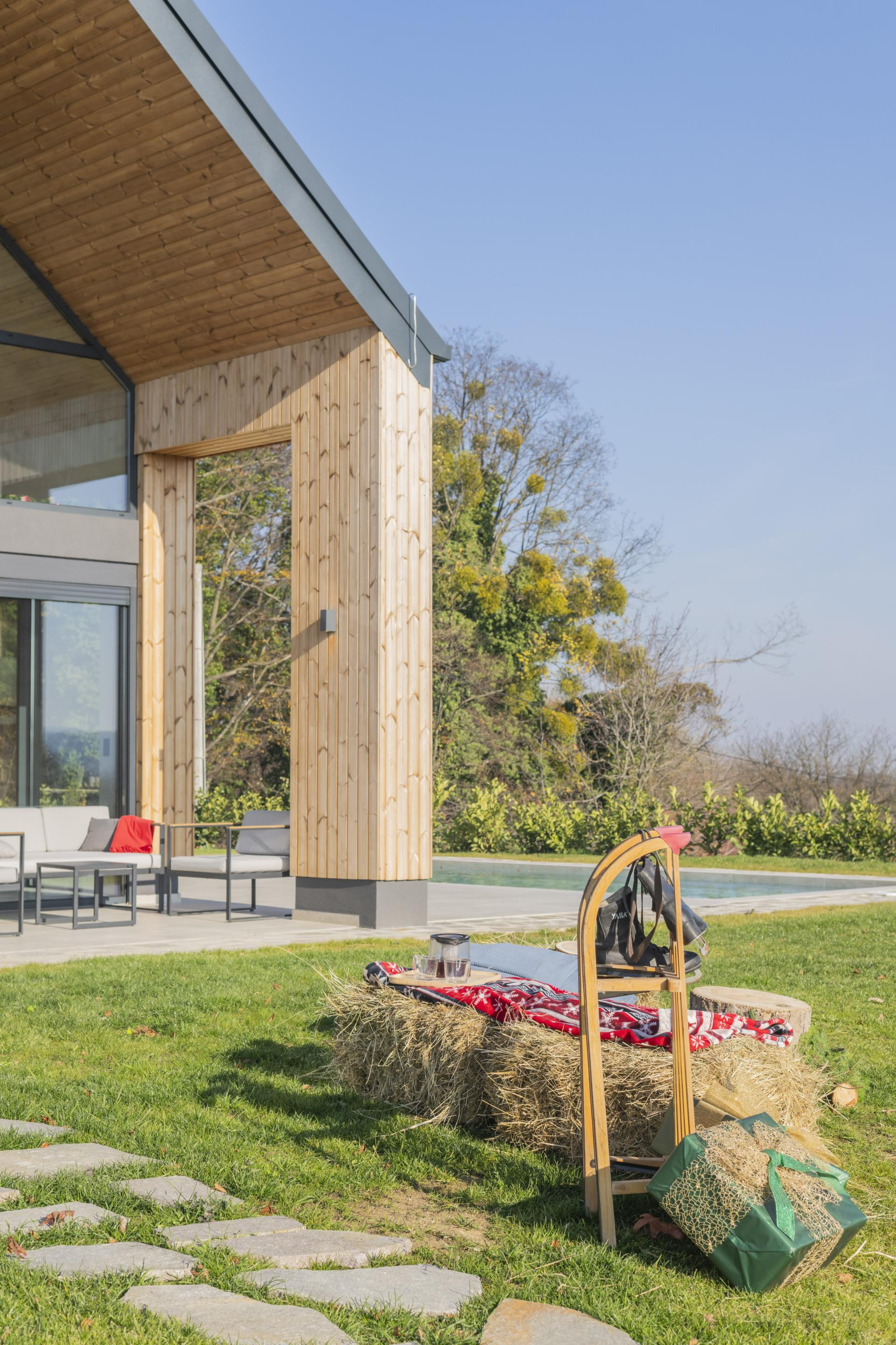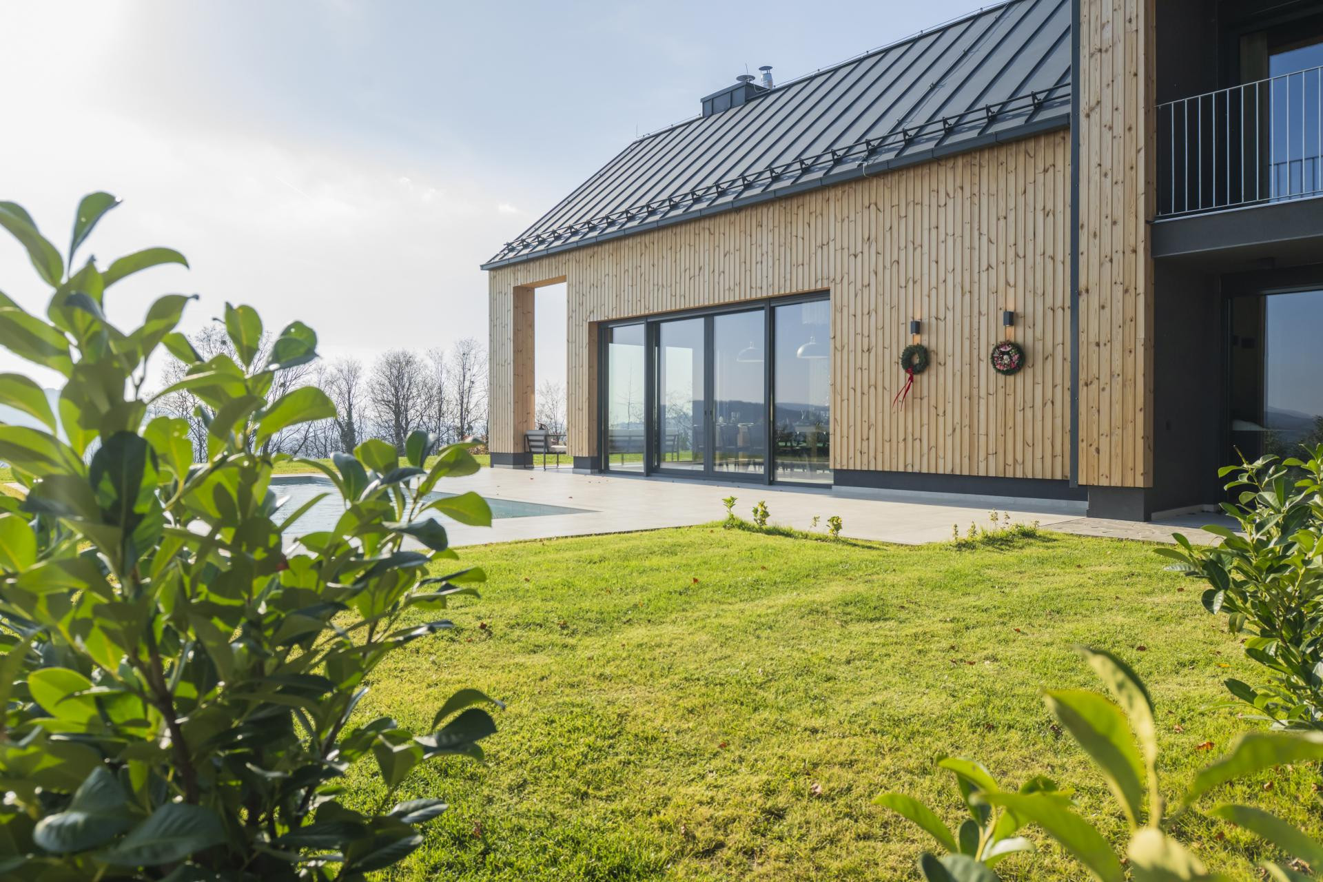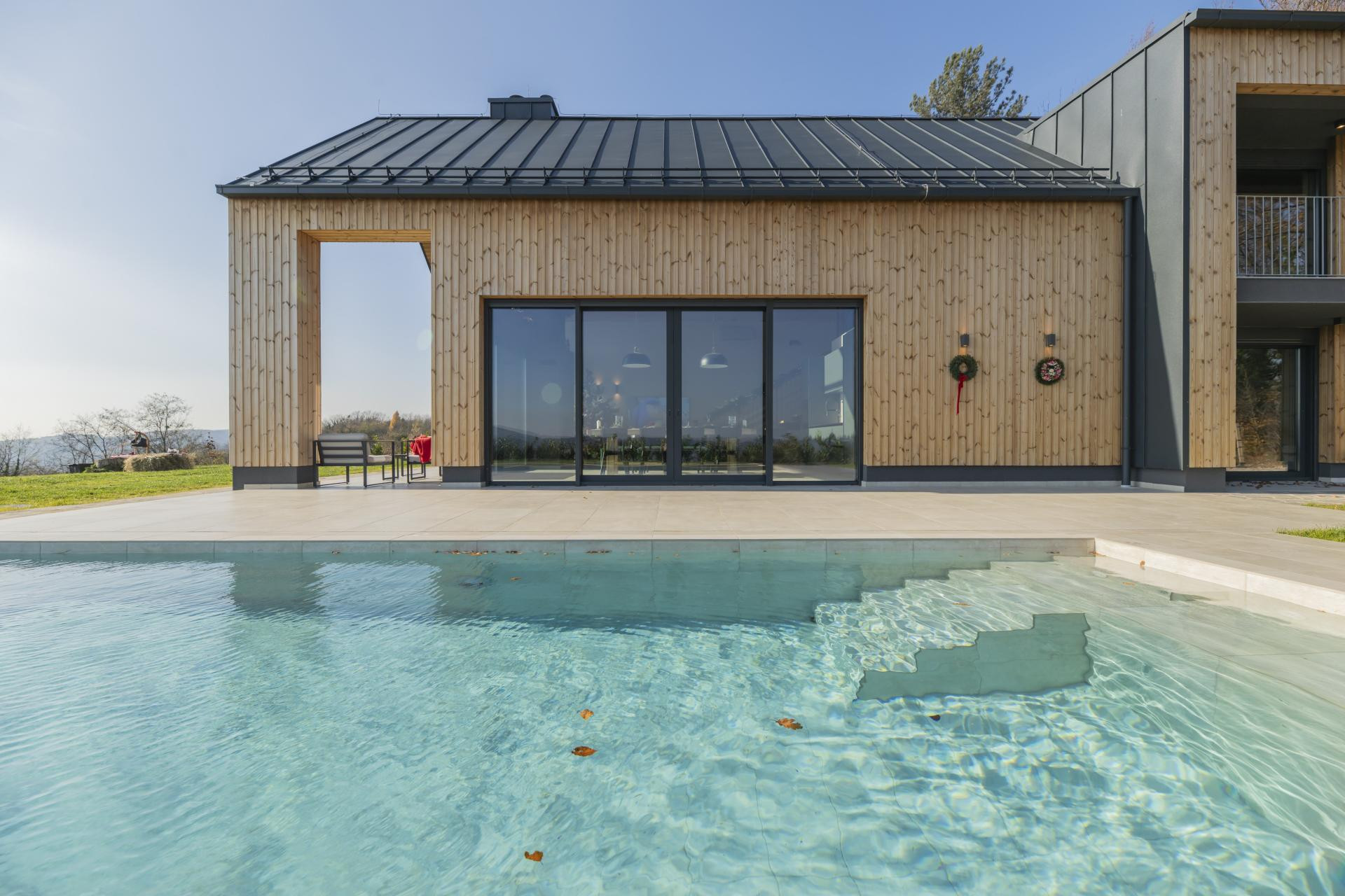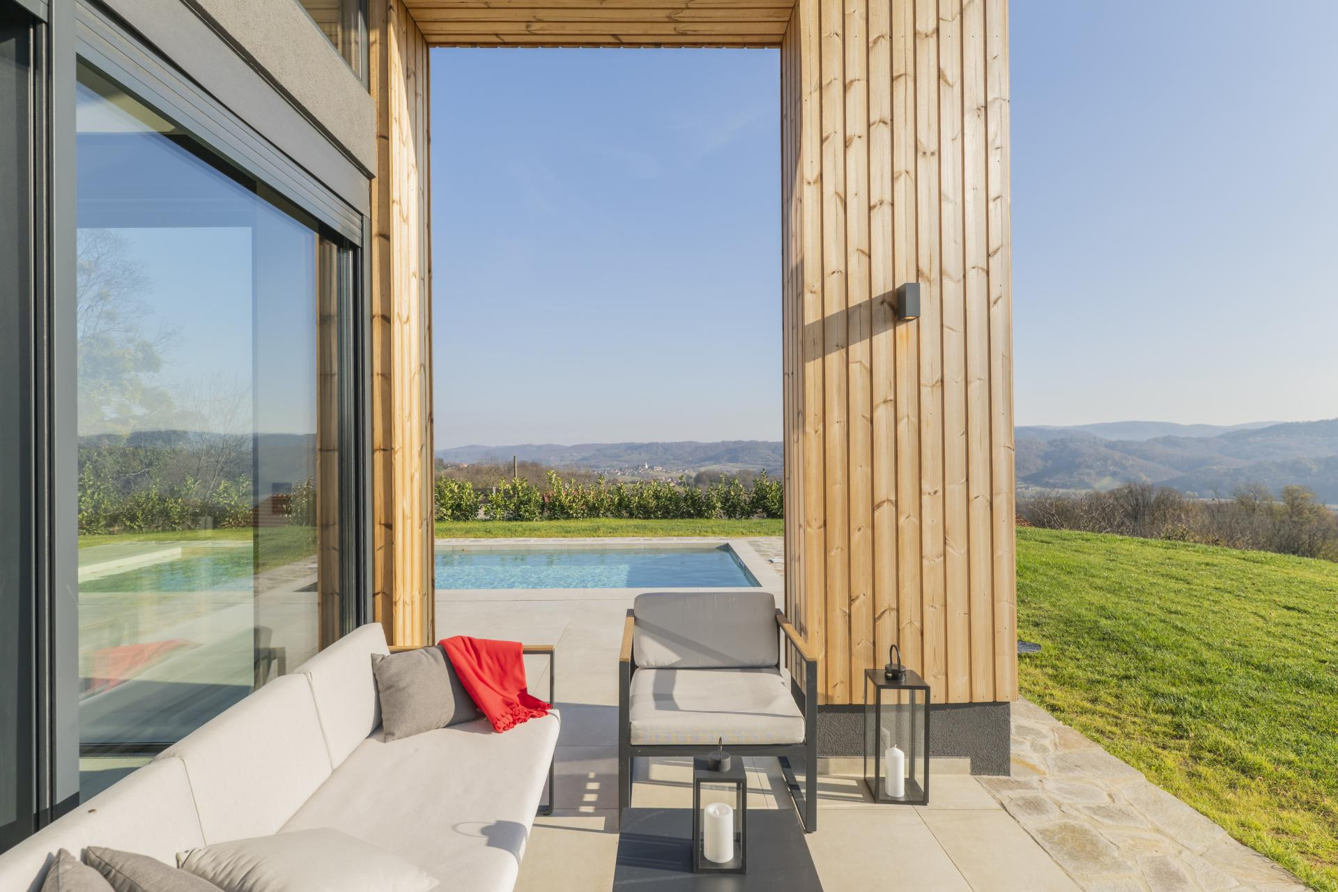 - Pozicionirali smo je tako da maksimalno iskoristi orijentaciju prema suncu, a otvorene površine okrenute su prema najljepšem dijelu parcele gdje je pogled na šumu, zelenilo i idilična brda. Eksterijer je specifičan po prirodnoj drvenoj oblozi, jednostavnim linijama i toplom, prirodnom dojmu - opisuje Dario.