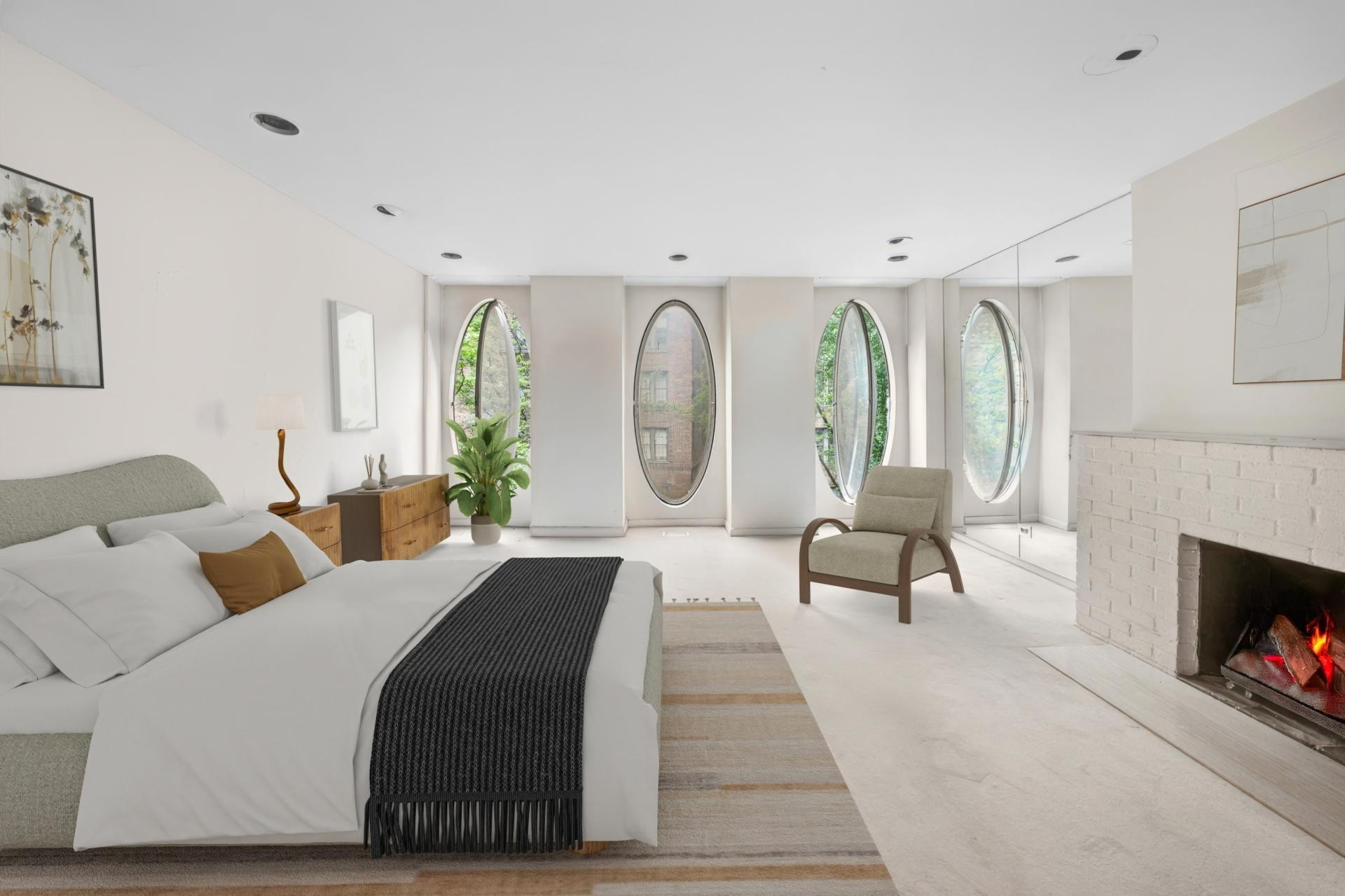 Interijer je u kontrastu s posebnom vanjštinom; jednostavan je, minimalistički namješten i pun svjetla. Interijerom dominiraju bijeli zidovi, čiste linije i tek poneki arhitektonski detalj, poput više kamina raspoređenih po kući. Stražnje dvorište, ograđeno visokim zidom i zaklonjeno drvećem, pravo je gradsko utočište. Riječ je o mirnoj oazi u srcu Manhattana, što kuću čini još posebnijom.