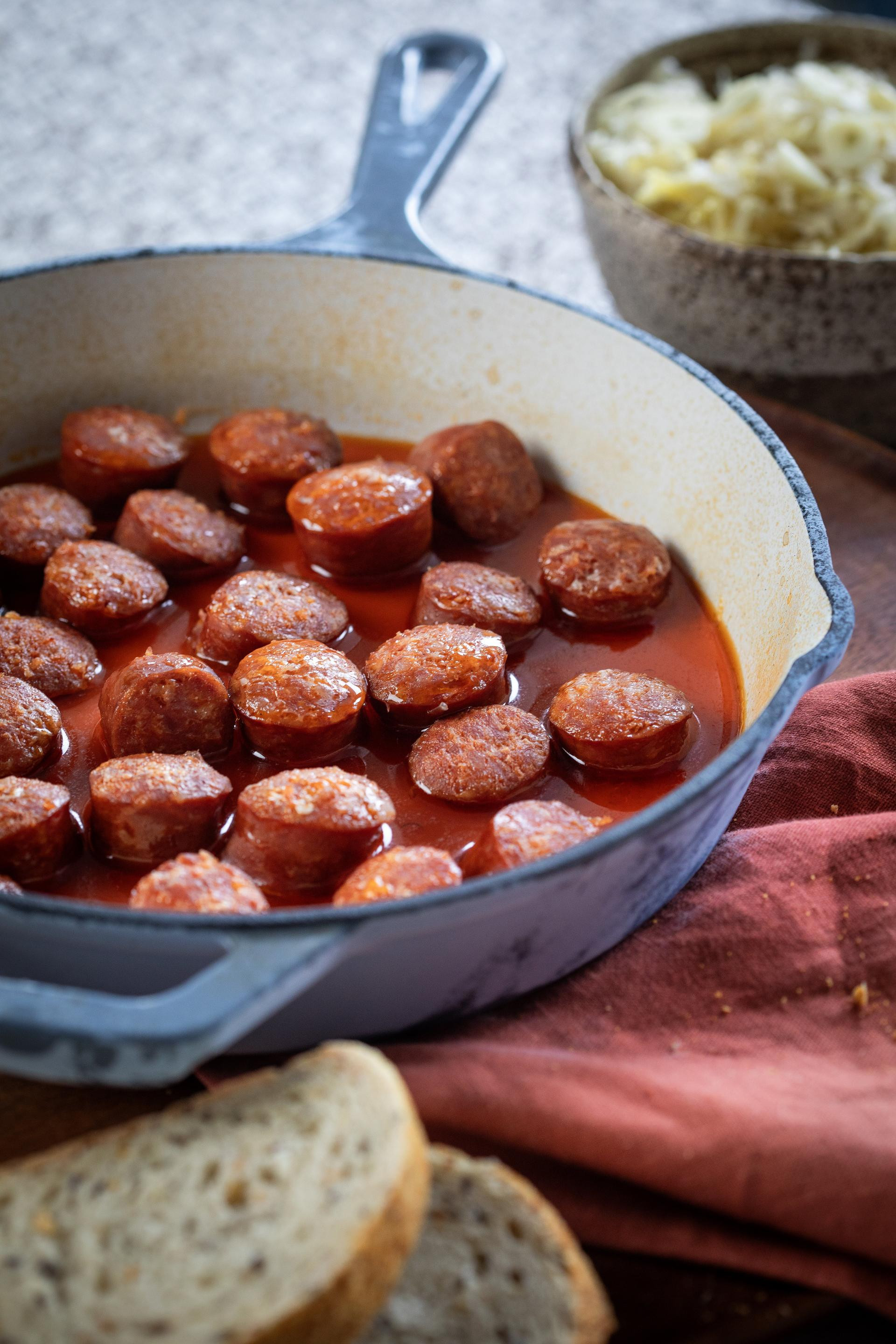 Svježe kobasice narezati na kolutače. Tavu dobro zagrijati, bez dodavanja masnoće, jer će kobasice same pustiti dovoljno masnoće tijekom pečenja. Kobasice staviti na vruću tavu i peći ih s obje strane dok ne dobiju lijepu boju i dok ne puste višak masnoće. Kada su kobasice dobro zapečene, podliti ih s jednim do dva decilitra bijelog vina. Pustiti da alkohol ispari, a zatim ostaviti da se tekućina reducira i lagano zgusne u fin umak koji obavija kobasice. U međuvremenu pripremiti kiselo zelje. Zelje začiniti solju i svježe mljevenim paprom, dodati obilno sitno sjeckanog ili protisnutog češnjaka te sve preliti s malo ulja i dobro promiješati. Kobasice poslužiti tople, s reduciranom vinskom glazurom, uz začinjeno kiselo zelje.
