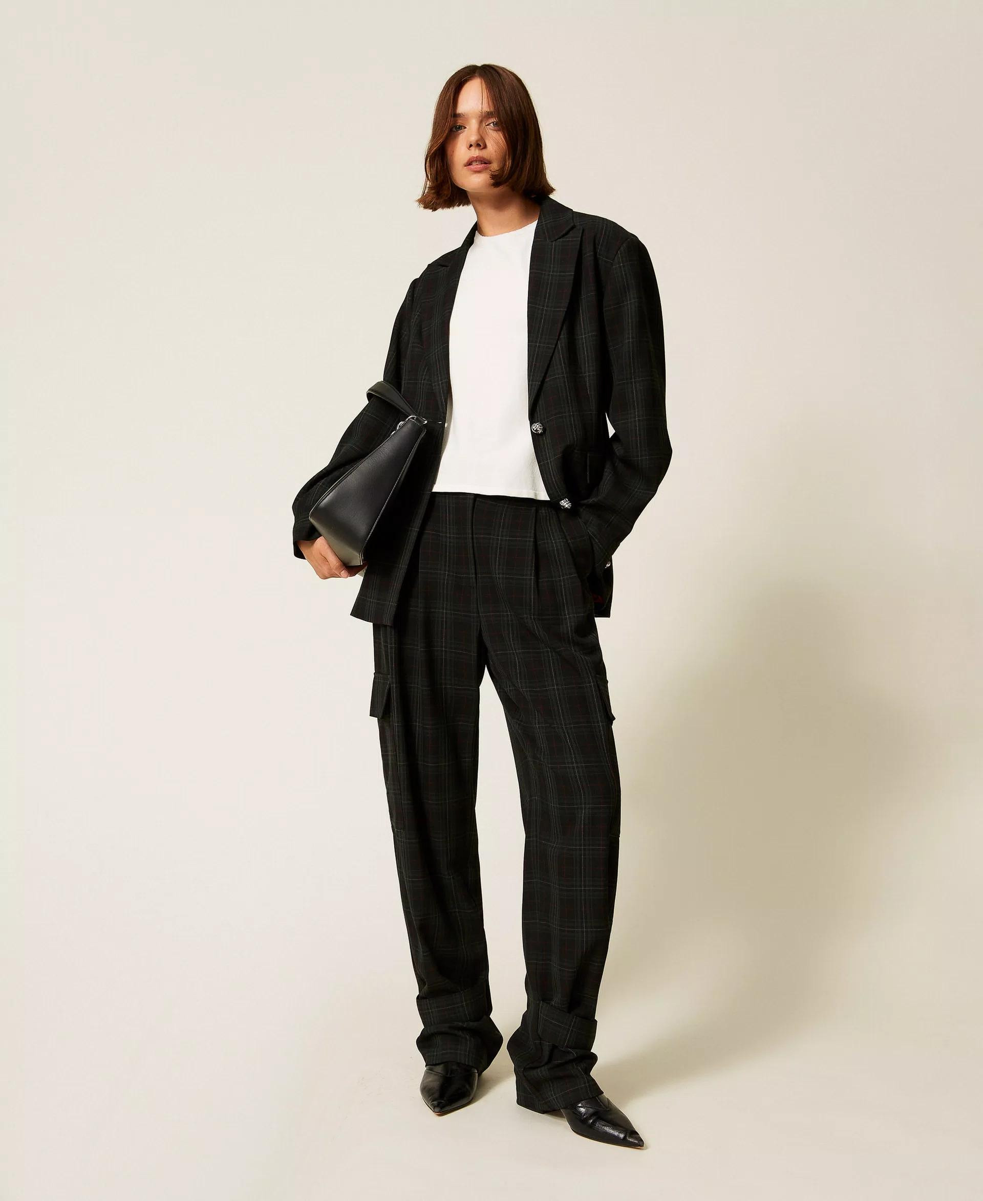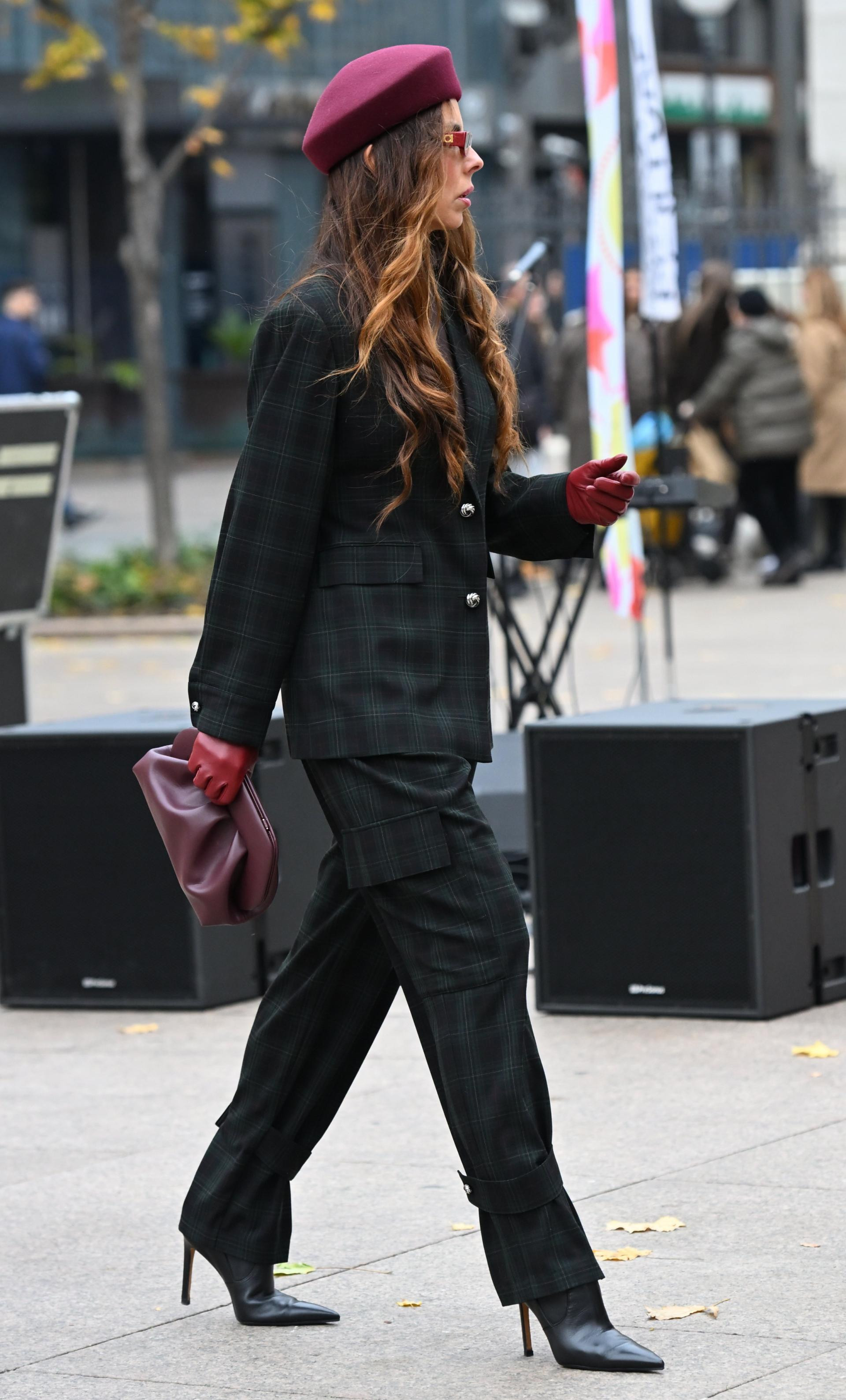 Za oko nam je posebno zapelo njezino tamnozeleno karirano Twinset odijelo, sa strukiranim sakoom koji naglašava figuru i hlačama ravnog, lagano opuštenog kroja. Zanimljiv detalj čine džepovi sa strane, inspirirani popularnim cargo stilom, koji odijelu daju trendi street style notu i savršeno balansiraju formalnost gornjeg dijela s opuštenim, suvremenim elementom.