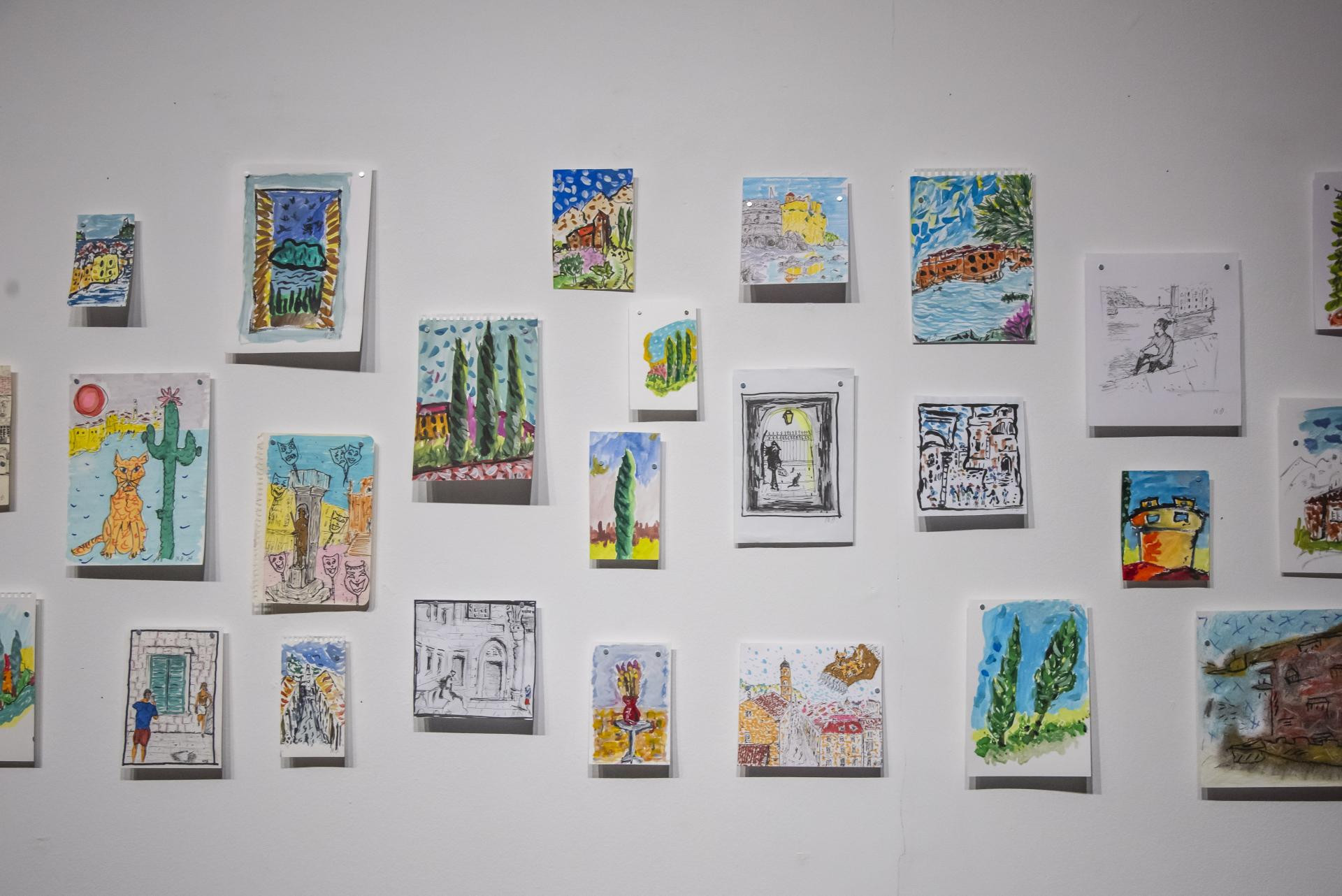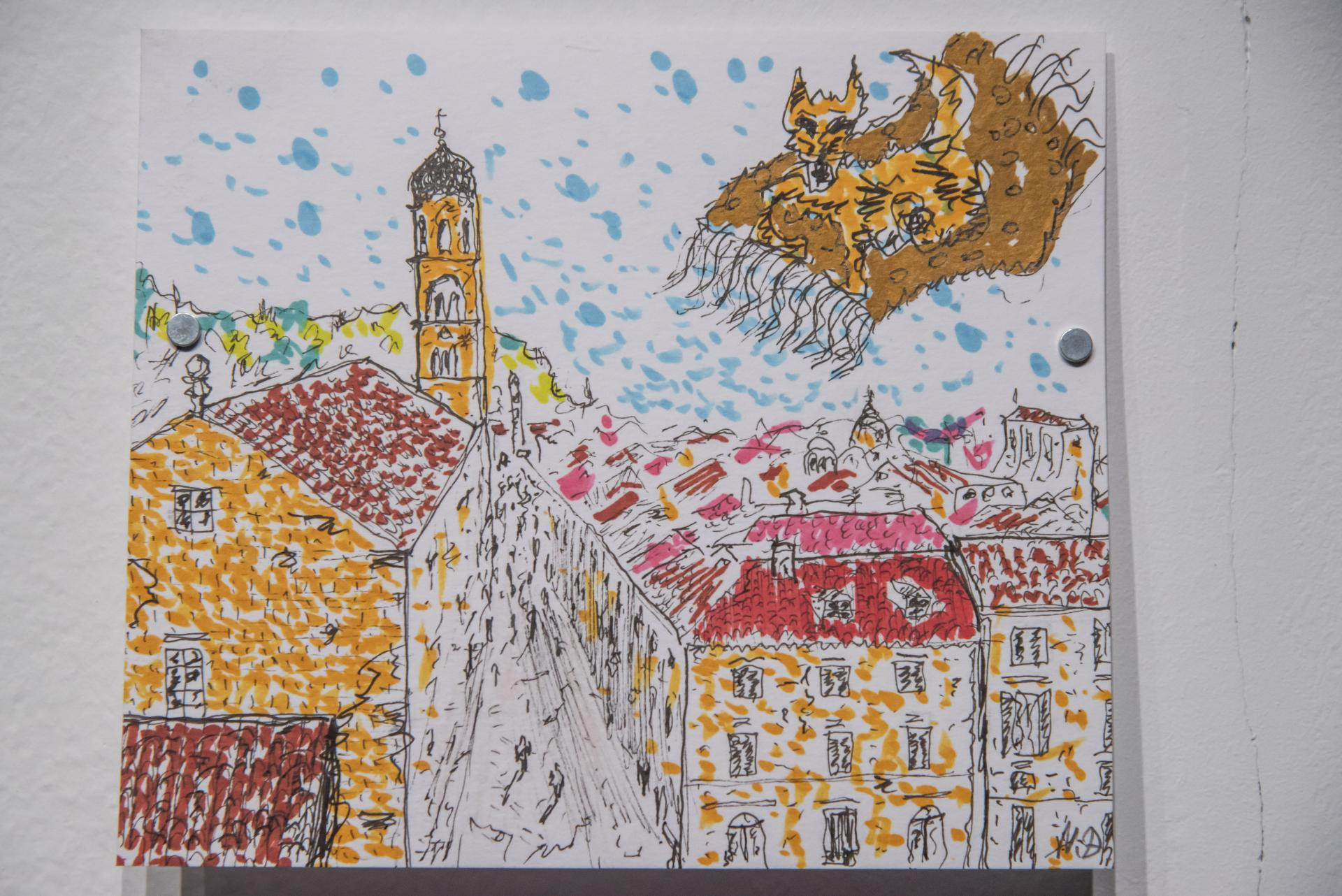 Na aktualnoj izložbi "Zidine. Horizonti", čiji je kustos Vanja Babić, Nino Đula ponovo izlaže svoje impresije Dubrovnika, ovaj put pred zagrebačkom publikom, u vrlo agilnoj galeriji Elvire Kranjčar na Kaptolu. Od pedesetak, koliko ih je bilo u predvorju dubrovačkog Kazališta Marina Držića, došao je do čak stotinu crteža, pažljivo raspoređenih na središnjem zidu i vitrinama uz vrlo efektan dodatak - dvije animacije nekih od izloženih radova koje je napravio uz pomoć umjetne inteligencije na nasuprotnim zidovima galerijskog prostora.