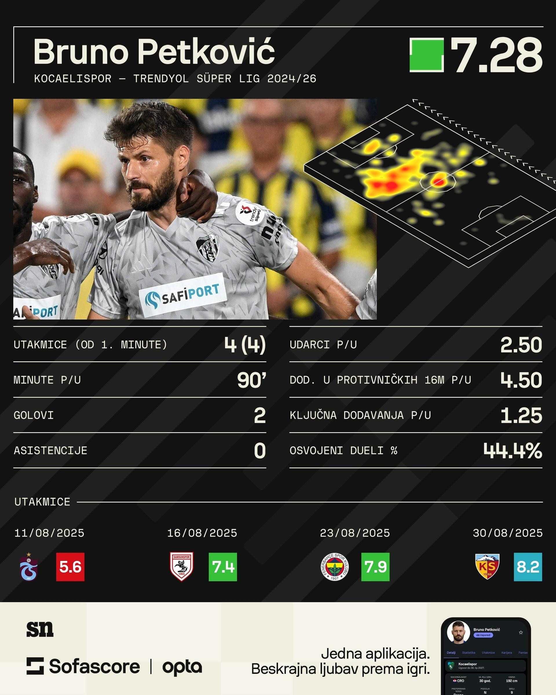 ‘‘Hrvatski napadač Bruno Petković, koji je na gostovanju kod Fenerbahčea pogodio iz slobodnog udarca, osigurao je prvi bod Kocaelisporu. Iskusni nogometaš uspio se izboriti za poziciju u kaznenom prostoru i duboko u sudačkoj nadoknadi spriječiti poraz svoje momčadi‘‘, piše turski portal Fanatik u članku pod naslovom ‘Petkovićev poljubac života‘.