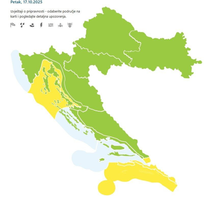 I sutra u Dalmaciji treba računati na kišu, pljuskove i grmljavinu, a mjestimice će oni biti i izraženiji. I na istoku unutrašnjosti su moguće prolazne oborine. Za Dubrovačku regiju je DHMZ za petak izdao i žuti meteoalarm zbog obilne kiše.